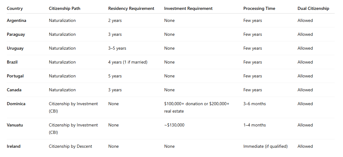 When it comes to measuring “ease,” four factors matter most: residency duration, financial cost, processing time, and dual citizenship flexibility. The table below summarizes the most accessible citizenship routes in 2025 — from fast naturalization to investment passports and lineage-based shortcuts.